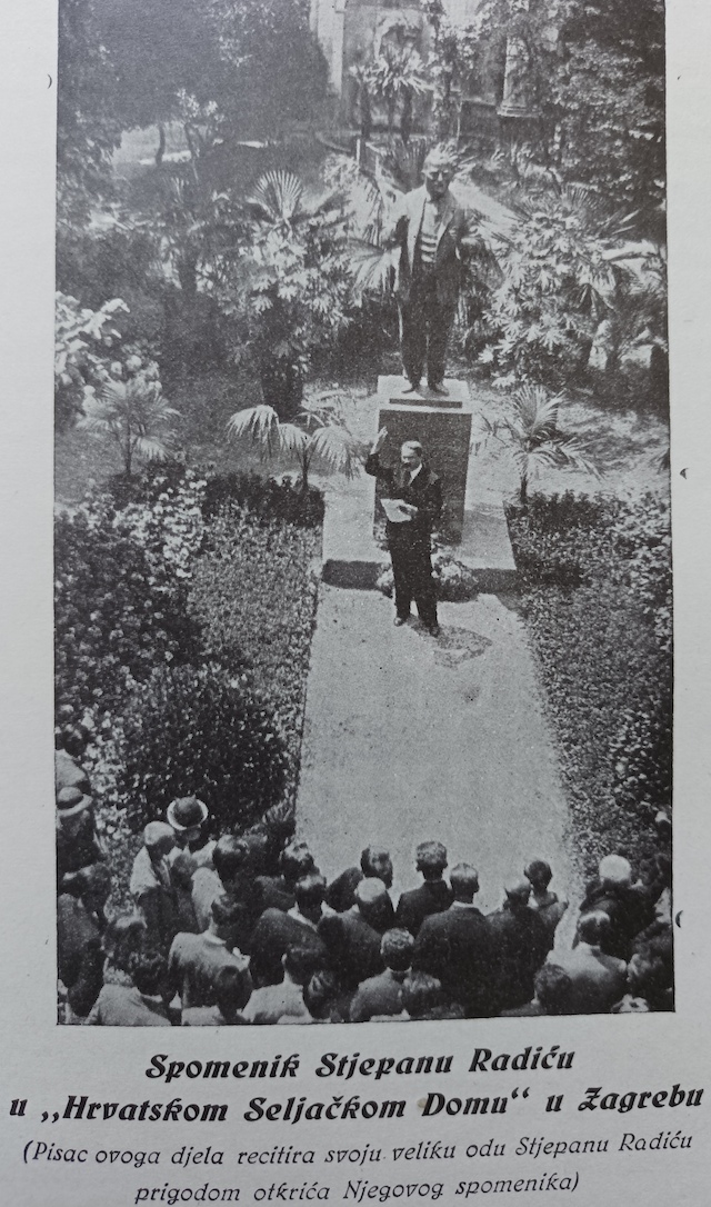 Govor Ive Šarinića 1928., pred spomenikom koji je izradila Mila Wod, istaknuta hrvatska kiparica.