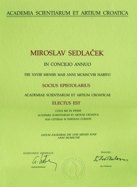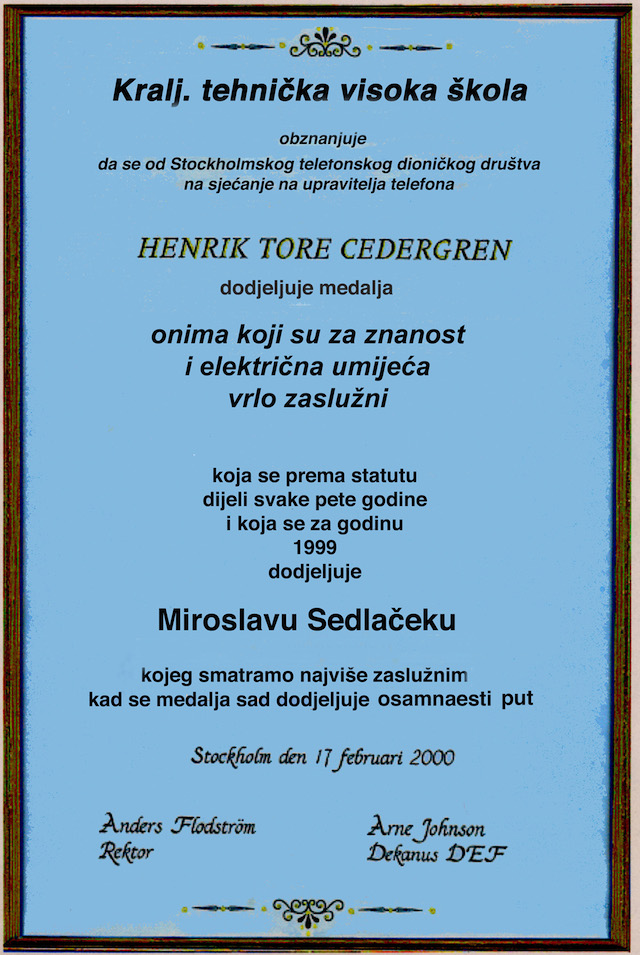 Zagreb, 12. veljače 2014. Ž I V O T O P I S Miroslav Sedlaček (u nastavku teksta MS) rođen je 31. svibnja 1925. u Karlovcu, gdje je pohađao osnovnu i srednju školu. Ispit zrelosti položio je 1943 godine, no taj mu je poništen 1945, pa ga je morao ponovno polagati 1946 godine. Upisao je Tehnički fakultet Sveučilišta u Zagrebu 1946 godine i diplomirao u prosincu 1952. Doktorat iz Tehničke fizike obranio je u svibnju 1962. na Elektrotehničkom fakultetu u Zagrebu. Od 1952. godine radi kao asistent, a kasnije kao stručni i viši stručni suradnik na Elektroničkom odjelu Instituta Ruđer Bošković na razvoju nuklearne elektroničke instrumentacije. Kao stipendist Instituta odlazi u veljači 1954. u Švedsku, na Institut za elektroniku Kraljevske visoke tehničke škole u Stockholmu. Tamo je najprije 4 mjeseca radio na teleskopu za mjerenje smjera iz kojeg dolazi kozmičko zračenje, preuredio i pregradio ga. Zatim prelazi u grupu koja je pod rukovodstvom prof. O. Wernholma, a za potrebe Sveučilišta u Lundu, konstruirala 1,2 GeV elektronski sinhrotron s izmjeničnim gradientom. U grupi je dobio zadatak razviti mikrotron, jedan novi model elektronskog akceleratora, koji je trebao biti injektor elektrona. Akcelerator je usješno proradio u proljeće 1958. tako da se je MS vratio u svibnju te godine u Zagreb. U Zagrebu je nastavio raditi na Institutu Ruđer Bošković do rujna 1965. U tom vremenu bio je i honorarni asistent, a kasnije i docent na AGG fakultetu gdje je predavao Fiziku, te na Elektrotehničkom fakultetu, gdje je sudjelovao u postdiplomskoj nastavi – Elektronska optika i Velike elektronske cijevi za mikrovalnu tehniku. Na Institutu Ruđer Bošković nastavio je u Stockholmu započete teoretske radove na stabilitetu staza elektrona u mikrotronu, što je bila i tema njegove doktorske disertacije. Usporedno radi i na elektroničkoj impulsnoj opremi za potrebe Odjela za zaštitu od zračenja, koji je u to vrijeme radio na razvoju halogenih GM brojača. Od 1961. godine je voditelj grupe koja je imala zadatak da razvije NMR spektrometar s visokim razlučivanjem za potrebe IRB-a. U rujnu 1965. ponovno odlazi u Švedsku na tešku operaciju kičme koju su organizirali profesori s Instituta za elektroniku u Stockholmu i IRB. Nakon operacije ostaje u Švedskoj kao docent na Kraljevskoj visokoj tehničkoj školi. U to vrijeme počela je grupa za akceleratorsku tehniku na Institutu za elektroniku raditi na projektu novog tipa mikrotrona, tzv. racetrack mikrotrona, s podijeljenim magnetom. MS je sudjelovao u razvoju akceleratora, i to posebno na teoretskom području i računarskoj simulaciji, kao i na konstrukciji i mjerenjima magneta i linearnog akceleratora. U toku 1970-tih godina grupa je razvijala CW i impulsne klistrone visoke snage, gdje je MS razvio program za simulaciju klistrona, kao i radio na njegovoj konstrukciji. Od 1983. do 1991. godine bio je voditelj grupe koja je konstruirala elektronsko hlađenje za CELSIUS prsten za The Svedberg laboratorij Sveučilišta u Uppsali. 1985 imenovan je profesorom iz Akceleratorske tehnike. Od 1974. godine MS predaje Elektronsku fiziku a od 1982. i Tehničku elektronsku fiziku na Fakultetu za elektrotehniku. U postdiplomskoj nastavi konzultacije sa studentima koji spremaju magisterij ili disertaciju. Umirovljen 30. lipnja 1991. U toku 1991., 1992. i 1993. radio je više mjeseci na konstrukciji, mjerenjima i stavljanju u pogon elektronskog hlađenja prstena COSY u KFA, Jülich, te 1991. na idejnom projektu elektronskog topa za visokoenergetsko elektronsko hlađenje u IUCF, Bloomington. Nakon umirovljenja MS je zamoljen od Alfvén laboratorija i od Fakulteta za elektrotehniku i informacijsku tehniku da nastavi predavati i surađivati u projektima laboratorija. Predavao je do 2005 godine a radio je na Zavodu do odlaska iz Švedske 2007 godine. 1998 godine bio je izabran za Dopisnog člana HAZU: Korištene kratice instituta i sveučilišta BESY Berliner Elektronsynchrotron, Berlin GSI Gesellschaft für Schwerionforschung, Darmstadt IUCF Indiana University Cyclotron Facility, Bloomington IKP Institut für Kernphysik, Jülich KFA Kernforschungsanlage, Jülich MSL Manne Siegbahn Laboratory, Stockholm SLAC Stanford Linear Accelerator Center, Stanford SSC Superconducting Super Collider, USA TSL The Svedberg Laboratory, Uppsala Publikacije 1. Knjiga Electron Physics of Vacuum and Gaseous Devices, John Wiley & Sons, Inc., New York, 1996, 538 pp, ISBN 0-471-14527-0 2. Znanstveni radovi Časopisi (svjetski) 1. Frequency swept proton stabilized high resolution NMR spectrometer (s I.Hrvoić, R.Mutabdžija, M.Petrinović) Colloque Ampere XIV (1967) 1005 2. A method for stabilizing particle orbits in the race-track microtron (s H.Babić), Nucl.Instr. and Meth., 56 (1967) 170 3. A permanent magnet for nuclear magnetic resonance spectrometer (s E.Boltezar, M.Petrinovič), J.Sci.Instr., ser. 2 (1968) 323 4. The 50 MeV racetrak microtron at the Royal Institute of Technology, Stockholm (s S.Rosander, O.Wernholm, H.Babić), Nucl.Instr. and Meth., 204 (1982) 1 5. Electron cooling in storage rings, Physica Scripta, T22 (1988) 204, editor 6. The CELSIUS Project (s D.Reistad et al.), Physica Scripta, T22 (1988) 256 na poziv Časopisi (hrvatski) 7. Mjerenje konfiguracije statičkog magnetskog polja metodom nuklearne magnetske resonancije (s I.Hrvoić, M.Petrinović), Elektrotehnika, 3 (1965) 194 8. Frequency swept proton stabilized high resolution NMR spectrometer (s I.Hrvoić, R.Mutabdžija, M.Petrinović), Elektrotehnika, 4 (1966) 241 Zbornici međunarodnih skupova 9. Microtron injector for the 1000 MeV electron synchrotron, Swedish Physical Conference 1955, Arkiv f. fysik, 11 (1955) 129 10. A 50MeV racetrack microtron (s O.Wernholm, S.Rosander i H.Babić ), IV all-union national conf. on particle accelerators, Moscow, 1974 11. Computational Calculation of Electron Trajectories, ECOOL-84, Karlsruhe, 1984, Proceedings of the Workshop on Electron Cooling and