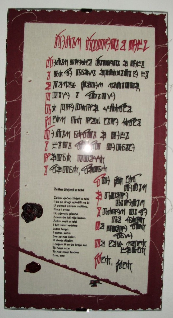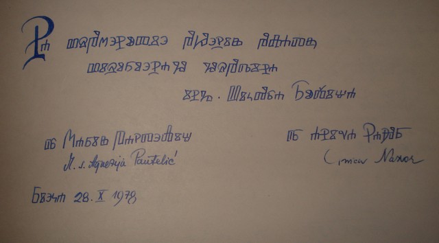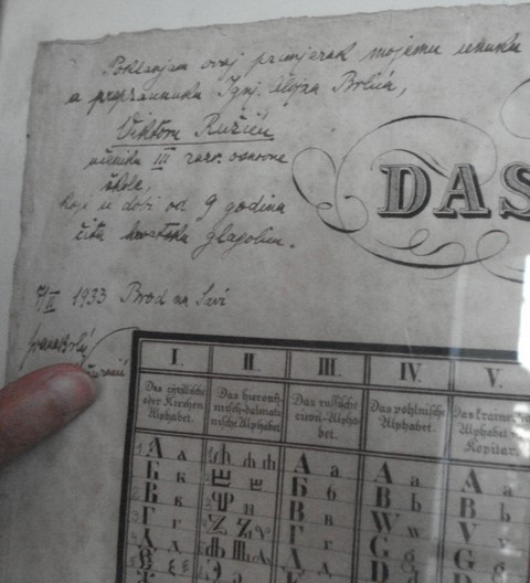 G. Nenad Hančić-Matejić, Düsseldorf, Njemačka, autor je brzopisnog glagoljskog fonta. Kao primjer pogledajte Iz Evanđelja po Ivanu - Proslov, pisano brzopisnom hrvatskom glagoljicom. Njegov vrlo lijepi glagoljski font "Croatica" dostupan je na adresi www.glagolica.com.nu, opisan na hrvatskom i njemačkom jeziku. Matilda Ružić, Villa Ružić, Rijeka (vilu vodi Theodor de Canzian Jakšić) Poklanja ovaj primjerak svojemu unuku a prapraunuku Ignj. Alojza Brlića, Viktoru Ružiću učeniku III. razreda osnovne škole koji u dobi od 9 godina čita hrvatsku glagoljicu. 1933. Brod na Savi Izvor www.fotke.hr Darko Deković (spomen knjiga): Dragim prijateljima zahvalan za gostoprimstvo Darko Deković siječnja 1984. M. s. Agnezija Pantelić (spomen knjiga): Na vspomenutie pohoenija polatje visoroenago gospodina ing. Viktora Ružića dr. Marija Pantelić, dr Anica Nazor Rieka 28. 10. 1978. Branko Fučić (spomen knjiga, 1978.):