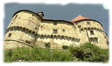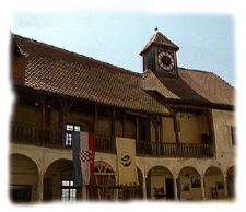 Vidimo i grbove grofova Celjskih i Rattkaya, fresku boga Dionisa-Bakhusa i druge zanimljivosti. Krećemo se opet strmim stubama mimo mjesta gdje je pronađena lubanja Veronike Desinićke, i dolazimo na treću etažu odakle cijelom galerijom sagledavamo ljepotu palasa svih galerija s predivnim krovnim površinama, sunčanim satovima i stupovljem. | |||