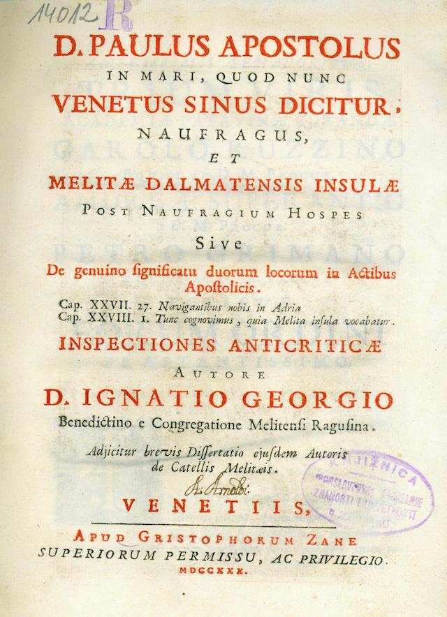 otoka Melite (Mljeta), objavljene godine 1730