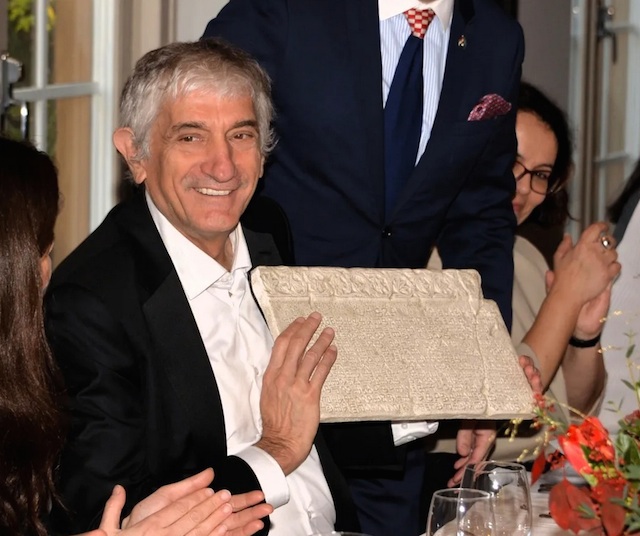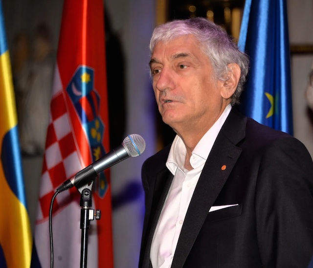 Croatia – Stockholm ![]() John Martinis watching the flag of the Republic of Croatia on the left. H. E. Siniša Grgić addressing to distinguished guest of the Embassy of the Republic of Croatia in Stockholm. This and the following three photos are from the above web page. ![]() ![]() Croatian Ambassador Siniša Grgić donating a replica of the Baška Tablet from the year 1100 (carved in Croatian Glagolitic Script) to John Martinis. ![]()
